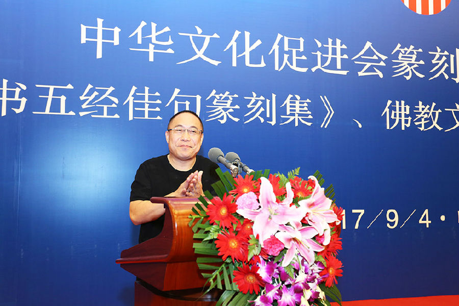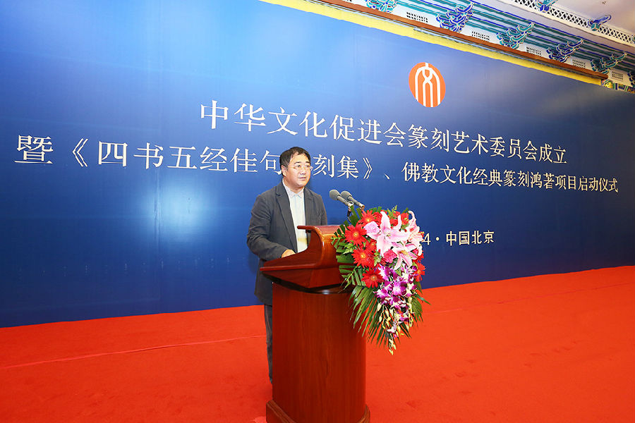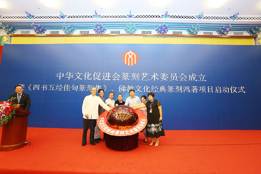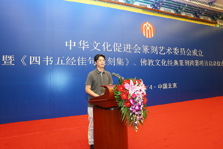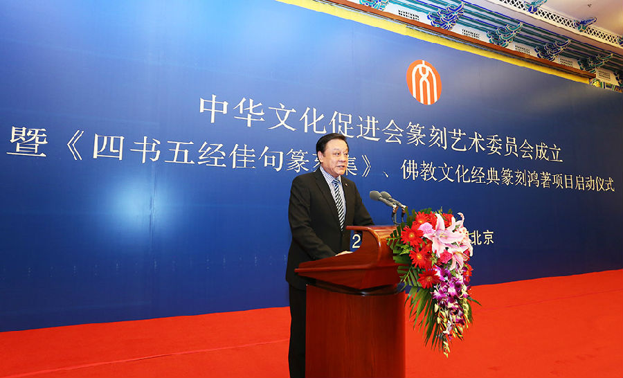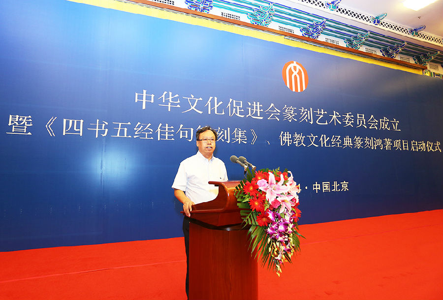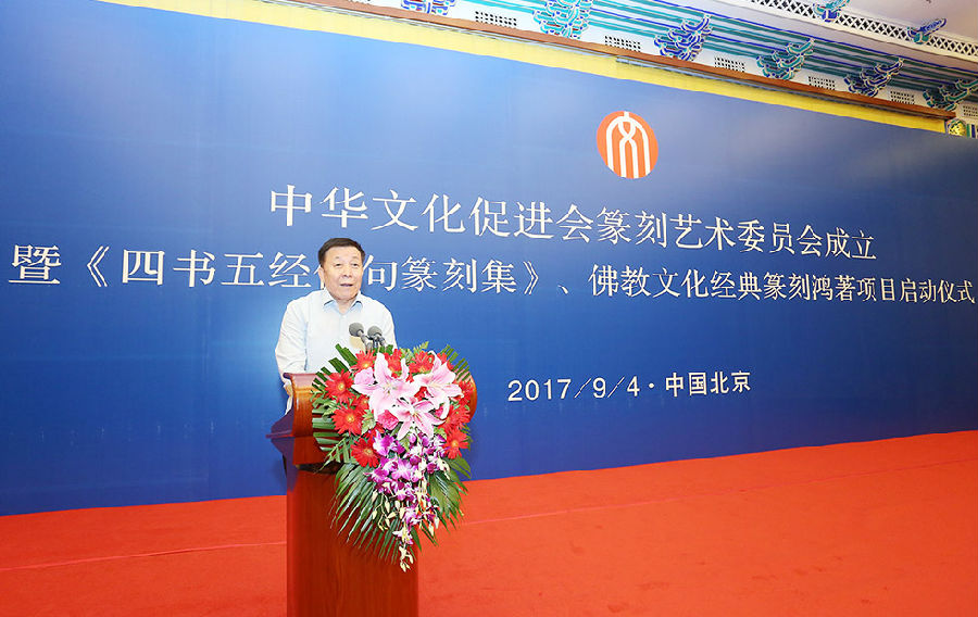 为贯彻近平习总书记文化创新方针,牢牢把握社会主义先进文化方向,坚持以人民为中心导向,形成健康积极的文化合力,文促会经过紧锣密鼓的准备,于2017年9月4日上午在全国政协礼堂举行“中华文化促进会篆刻艺术委员会成立暨《四书五经佳句篆刻集》和佛教文化经典篆刻鸿著项目启动仪式”。