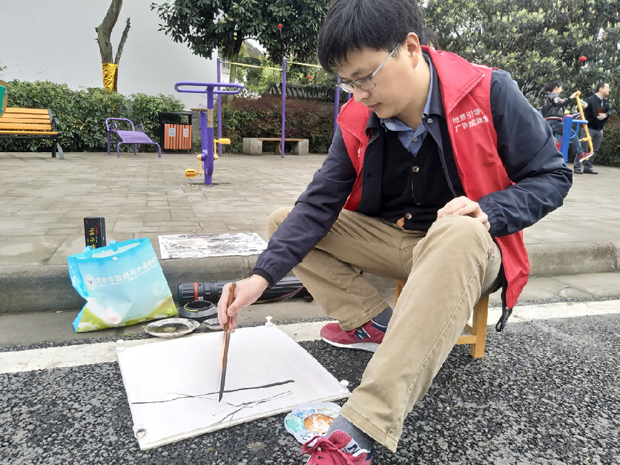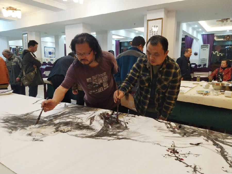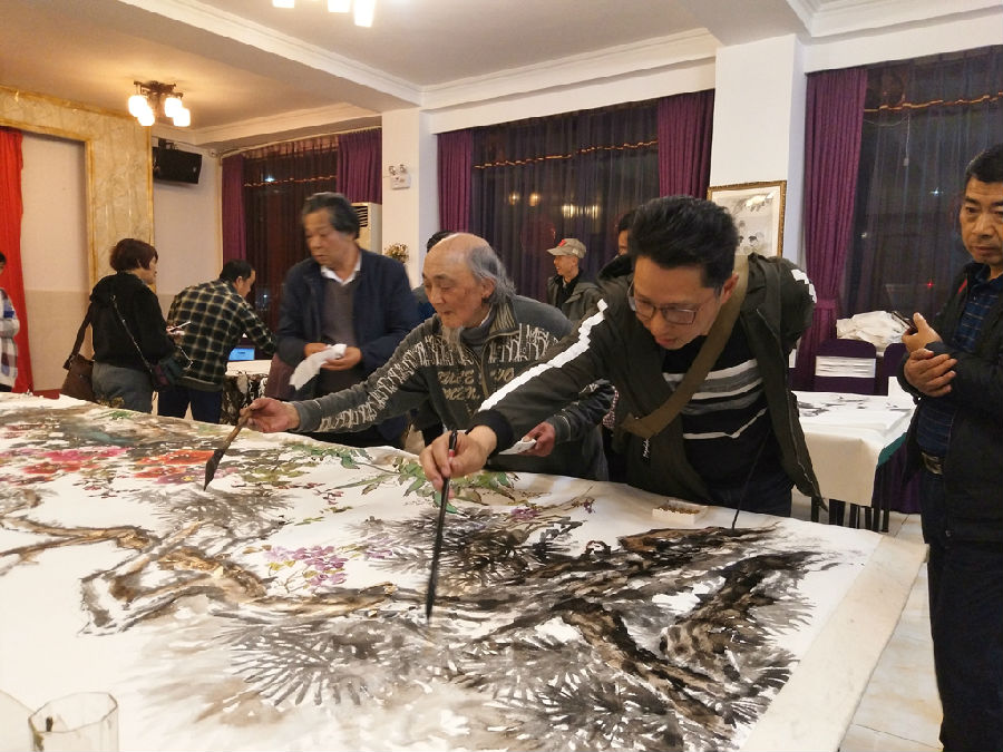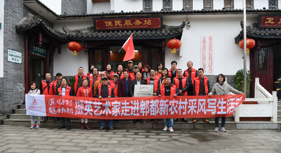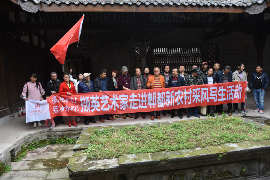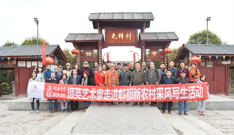 郫都区新农村建设与发展有着悠久的历史。特别是党的十八大以来,郫都区战旗村坚持以农业供给侧结构性改革为主线,深化农村土地集体产权、农业新型经营主体社会化服务体系等综合配套改革,再次刷新多项“战绩”——率先开展清产核资、股权量化,成立村集体资产管理公司,敲响全省农村集体经营性建设用地入市“第一锤”。在改革过程中不断锐意进取,犹如一面飘扬的旗帜。巴蜀撷英书画院深入学习党的十九大精神,贯彻党的新农村发展理念,顺应历史潮流,反映新时代精神,为画家提供有一个了解新农村的窗口,为艺术家和振兴乡村战略搭建服务平台,从而能够更好地描绘新时代新气象。采风活动期间,艺术家们还共同合作完成了两幅巨型国画《春洒崇宁》和《醉吟图》,以及一大批优秀书画作品。