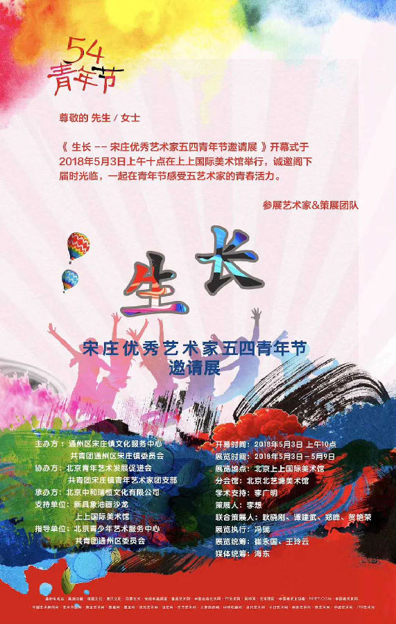 2018年5月3日上午十点《生长--宋庄优秀艺术家五四青年节邀请展》开幕式将于上上国际美术馆举行。本次展览由通州区宋庄镇文化服务中心、 共青团通州区宋庄镇委员会主办,北京青年艺术发展促进会、共青团宋庄镇青年艺术家团支部协办,北京中和瑞恒文化有限公司承办,还得到了新具象油画沙龙和上上国际美术馆的大力支持,更有北京青少年艺术服务中心 、共青团通州区委员会做为指导单位。