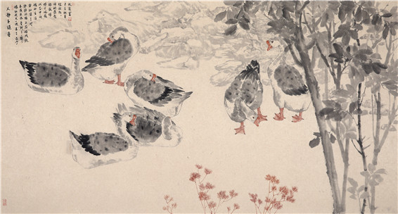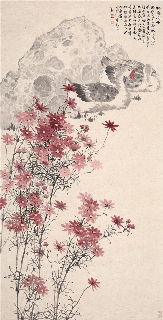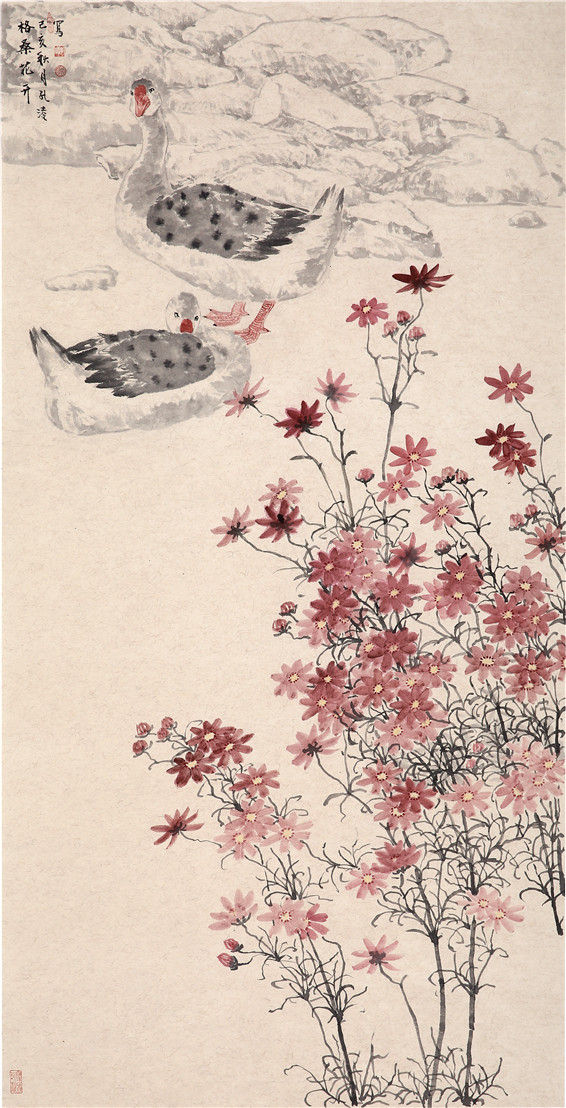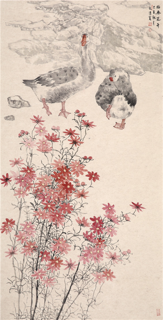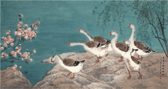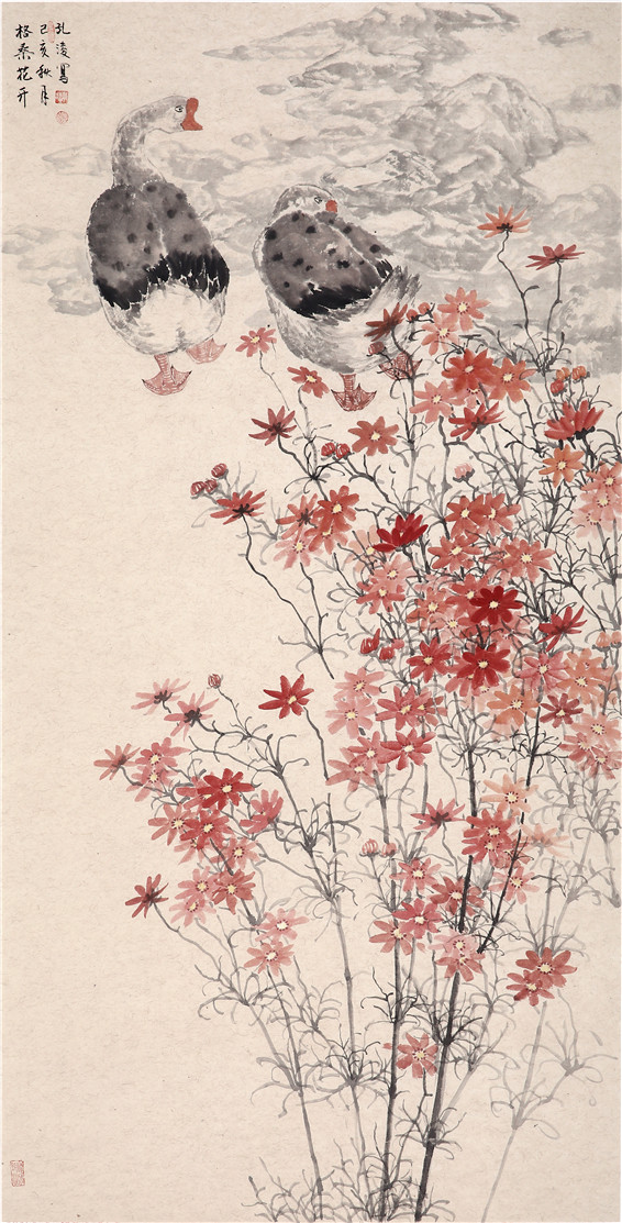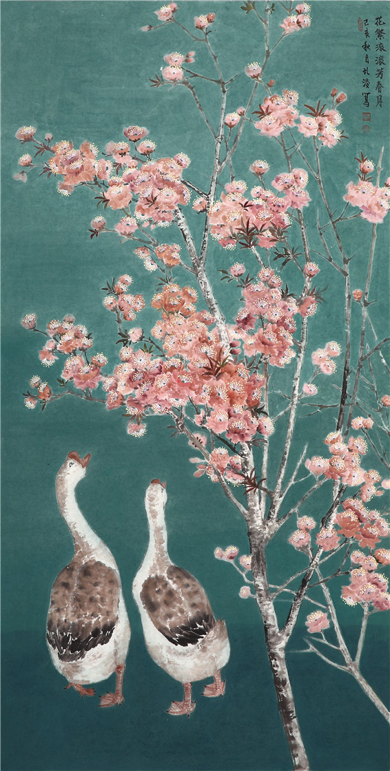 观孔淩的工笔花鸟画,直观感受便是借物抒情。擅以拟人的手法在画中传递诗意、表达情怀。无论岸边“鹅”,还是坡岭“松”,都以交织互融、相依私语、婀娜高冷的姿态示人。并且画面形象、构图以及颜色关系,也都体现着个人的隐喻风格,令观者驻足、令行家赞许。