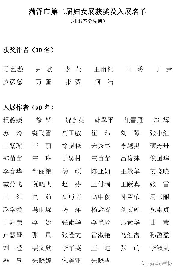 由菏泽市文学艺术界联合会、菏泽市妇女联合会主办,菏泽市书法家协会、菏泽市书法家协会女书法家工作委员会承办的“菏泽市第二届妇女书法作品展”评选工作已结束。本次大赛共收到稿件229件,经菏泽市书法家协会评审创作委员会评审。最终选出10件获奖作品,70件入展作品,共计80件作品。现将作者名单公示如下: