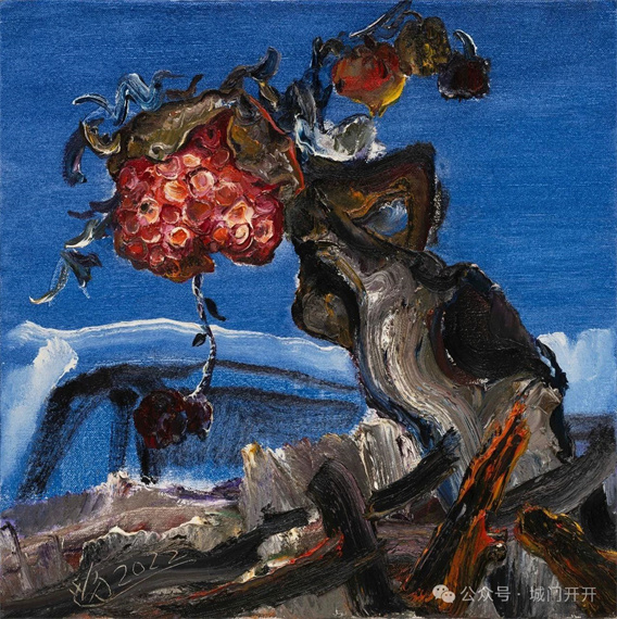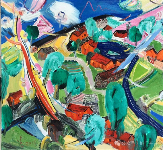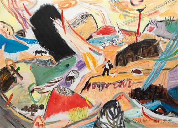 正是因为程晓光从纵向上沿袭了林风眠、吴冠中等人的文脉,使其意象油画不再是一个孤立的文化事件,而是嵌入到艺术史的发展轨迹中,具有了上下文的逻辑关系。同时,他又通过不断写生,介入时代现场,从横向上展开对意象油画的探索。故而,程晓光的意象油画,又有强烈的时代气息,相较于前人也更具表现的力度。比如他喜欢大尺寸画布,用油画大刷子在上面横涂竖抹,从而以意领气,使其画面畅快至极;比如他的色彩营造特别强调厚重的肌理感,于恢宏的气势中,又透出斑斓凝重、朴拙粗粝的精神质感。与此同时,程晓光表现的主题也是多种多样,不仅有写生的风景,也有观念的山水;不仅有人物造型,也有社会景观;不仅有现实的物象,还有梦里的桃花源……总之,程晓光承接意象油画的传统,不仅拓展了其表现的空间,也丰富了它的社会和文化语义。