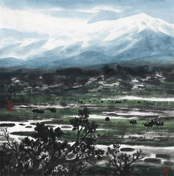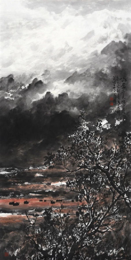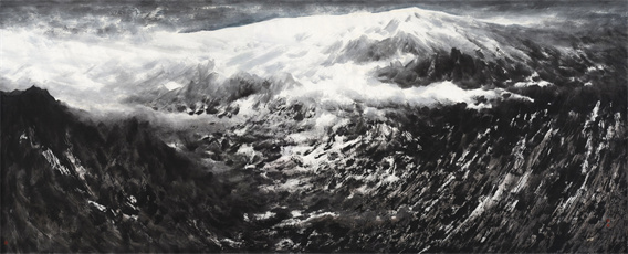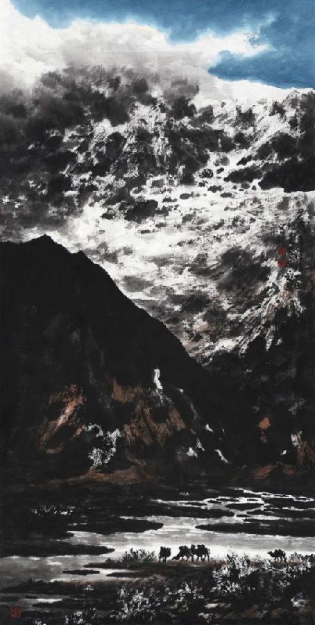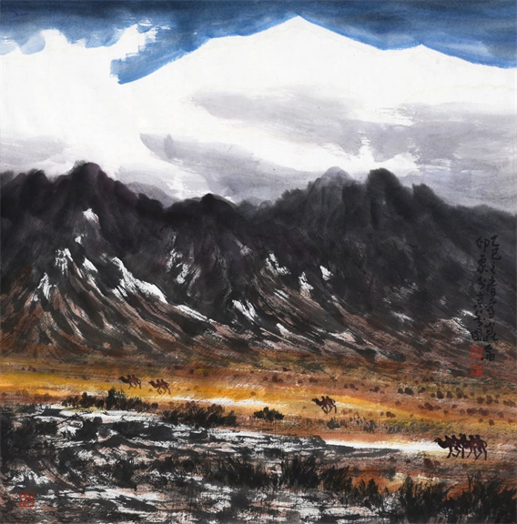 马万国作为“昆仑入画第一人”,其笔下的昆仑意象早已成为中国美术界的重要标识。他曾于1994年、2014年两次在中国美术馆举办个人昆仑主题画展,其作品以“大气象、大笔墨、大格局”让业界耳目一新,引发了理论界的持续关注与热烈探讨。尤为值得称道的是,他本次展览作品主要以独创的“昆仑皴”笔法完成。此皴法以如青铜铭文般雄浑苍劲的笔触,生动表现昆仑山历经亿万年风化的嶙峋岩壁,赋予山体以深邃的“历史褶皱”质感。画面中裂痕密布、风骨铮铮的昆仑山脉,早已超越自然景观的描摹,升华为“千磨万击还坚劲”的民族精神图腾与视觉隐喻,展现出撼人心魄的艺术力量。