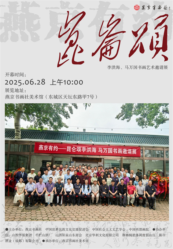 2025年6月28日,燕京有约系列主题展之“昆仑颂·李洪海、马万国书画艺术邀请展”于燕京书画社美术馆盛大启幕。此次展览共展出李洪海、马万国的书画新作近60幅。围绕昆仑山的创作主题,两位艺术家分别以书法、绘画展现对祖国壮美山河的赞美。苍劲有力的书法线条,厚重拙朴的笔墨渲染,将昆仑的雄浑气魄与文化内涵进行了神韵再现。本次展览由燕京书画社、中国世界民族文化交流促进会、中国社会主义文艺学会、中国西部画院联合主办,山西华煤集团、牛栏山酒厂、山西阳泉山东商会、北京华利文化有限公司、雁栖桐里休闲度假山庄、陈今酒业(成都)有限公司、北京动力水源科技有限公司协办。开幕式由著名主持人蔡成刚先生策划主持。