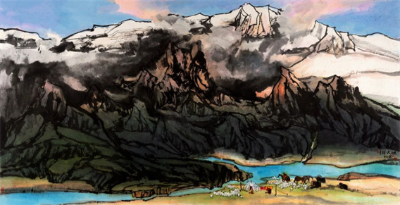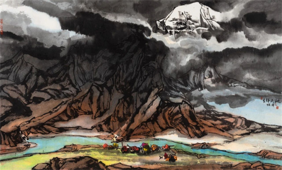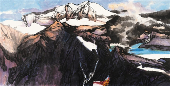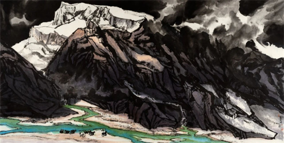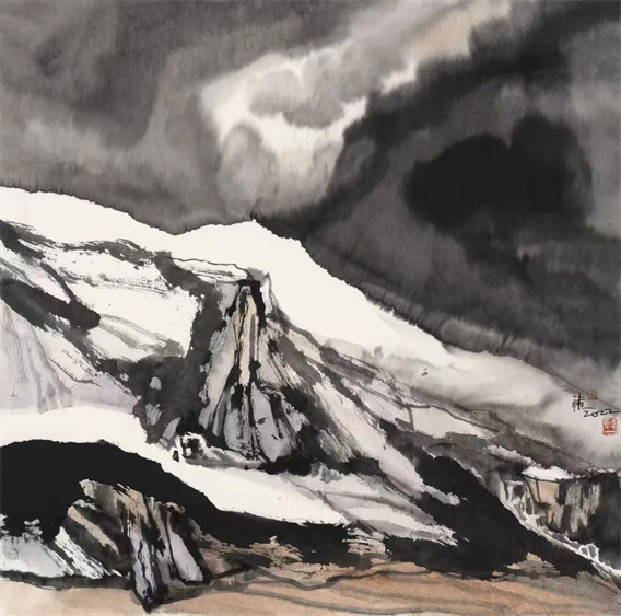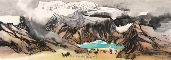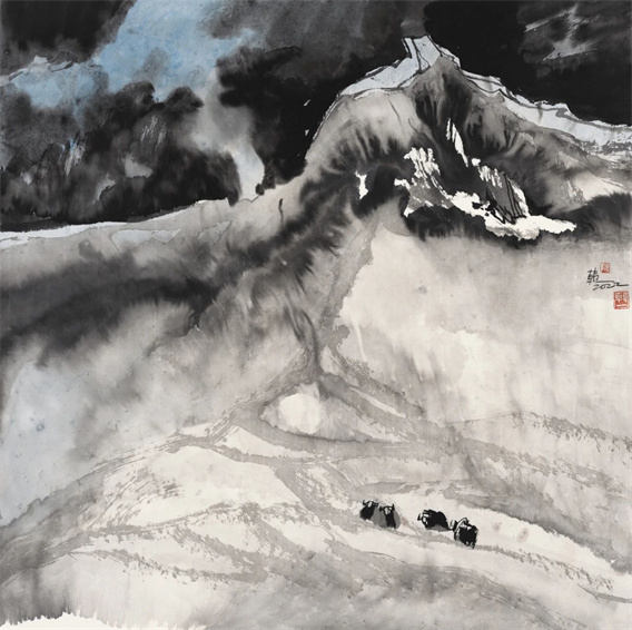 韩一山水画作深植于西藏的广袤大地。她以“收尽奇峰打草稿”的虔诚深入藏区,在艰苦跋涉中采集天地雄浑之气。然而,她并非简单搬运眼中风景。当画笔触及宣纸,写生所见便与胸中丘壑融汇,化为“闭目如在目前”的深沉心象。那水墨流动间,分明是艺术家生命与高原魂魄的共振。正如石涛所悟“山川使予代山川而言也”,韩一画中每一道墨痕,皆是她生命与高原魂魄共震的私语。她所呈现的,已远非西藏的形貌,而是西藏在她心灵深处激起的雄浑回响。