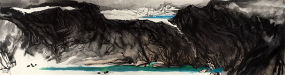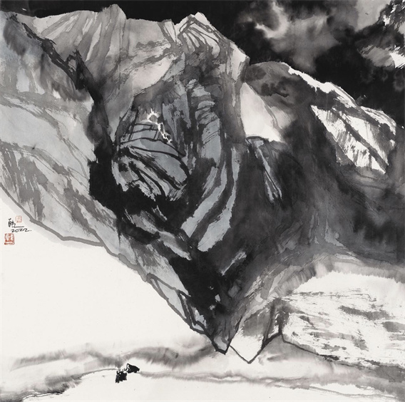 韩一艺术最动人之处,在于她以全景式的宏大格局描绘山水,却不忘将镜头温柔推近,凝视那些在大山褶皱里生息劳作的民众。画中人物与屋舍并非点缀,而是与山峦流水血脉相连的整体。这种将生存图景有机融入壮阔山河的独特视角,赋予作品既宏大又亲切的双重气质。画面中墨色氤氲的黑白灰构成某种视觉上的“陌生感”,却奇迹般唤醒了观者血脉深处对土地、对生存的原始眷恋与守护之念。陌生与亲切于此奇妙交织,展现出一种深邃而质朴的生态美学。