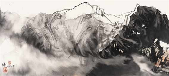 韩一以笔为舟,引领观者驶入刚柔相生的玄妙境界:山之骨与云之血在此交融。那铮铮山骨,是“知其雄”的傲然挺立,是宇宙间坚韧不拔的意志彰显;而那缭绕的云血,则是“守其雌”的深沉涵容,是天地间无所不包的柔韧气度。刚与柔,本为两极,却在她的宣纸上激荡共鸣,奏响深沉的生命韵律。这种矛盾美学,不由令人联想到海德格尔关于“大地”与“世界”的哲思——韩一笔下,山石如大地般坚实闭锁,而云烟则似世界般澄明敞开。二者在画面中既相互角力,又彼此成全,最终凝结为一幅冲突与和谐共生的视觉诗篇。