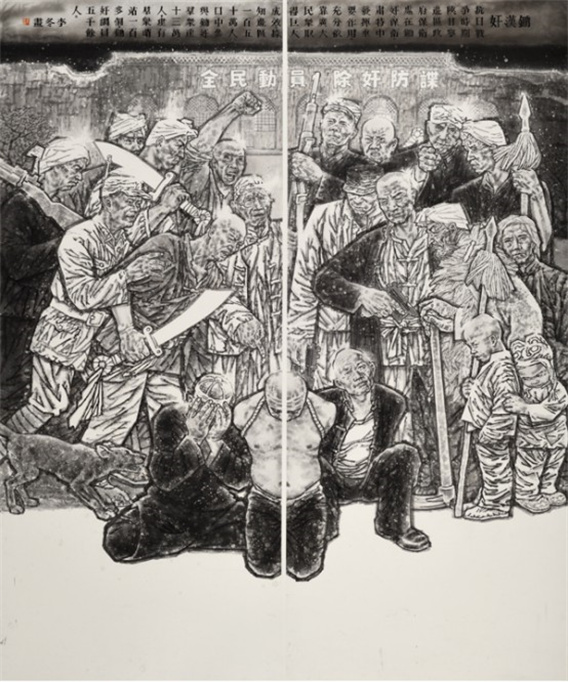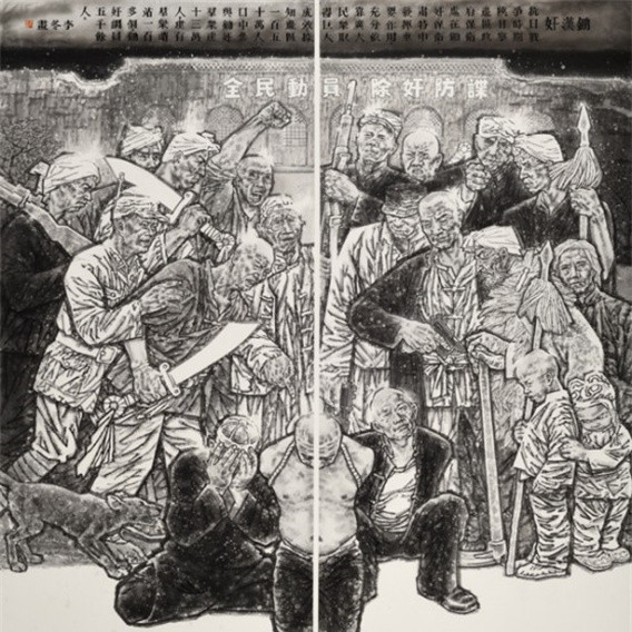 在纪念中国人民抗日战争暨世界反法西斯战争胜利八十周年之际,李冬通过大量调研创作了大幅人物题材水墨画作品《锄汉奸》,据知,该题材在此前从未被业内画家这般涉足过。该幅作品描绘的时代背景如下:抗战时期陕甘宁边区的一百五十万人口中,参与锄奸的群众竟达十三万之众,群众哨站密布如林,多达一百多个,锄奸网员亦达五千余人。这些数字的背后展现出了那个年代“全民动员,锄奸反谍”的历史场景,重现了当时陕甘宁边区政府保安处充分行使职责,依靠广大民众做好锄奸保卫工作,守护家园的峥嵘岁月。