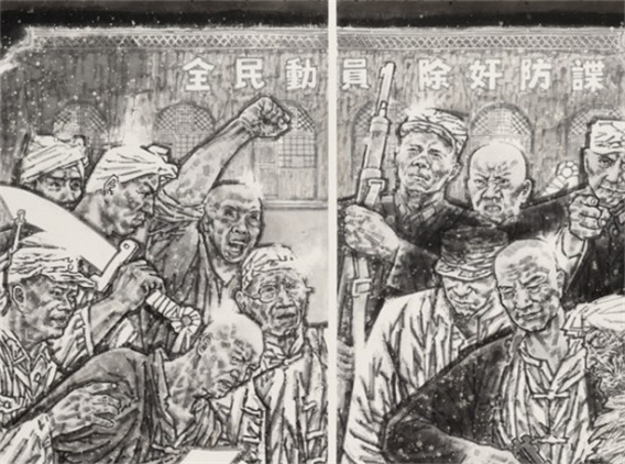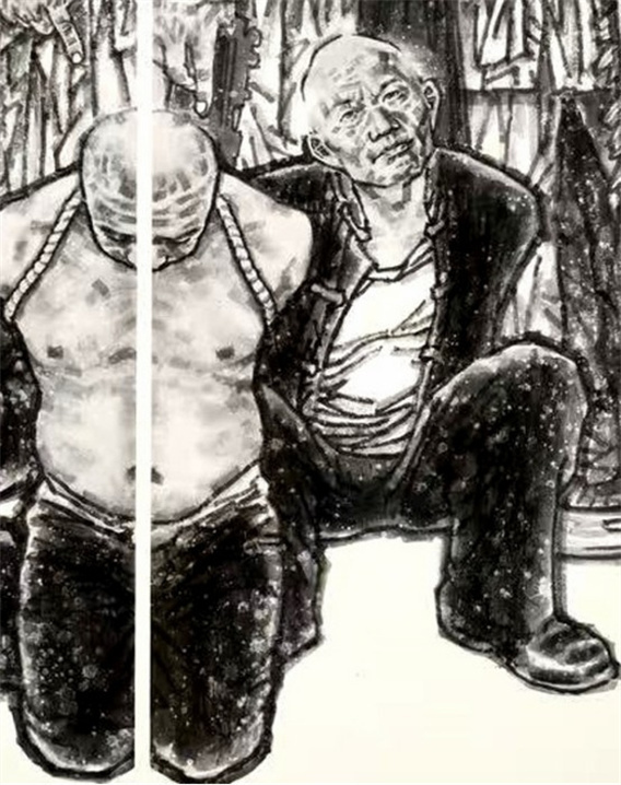 李冬在《锄汉奸》画面中通过艺术手法强化了一种力量感,严整构图板块里充斥着一种运动中的能量,丰富的墨韵营造着一种情感氛围,画家用苍劲有力的笔触,在写实与写意之间凸显出了个性的技法语言,这种绘画图式与表达的主题思想相得益彰。《锄汉奸》作品不光展现出画家作为先辈后人的不忘初心,对辉煌历程的庄严致敬,更展现出了画者赤诚的民族之心和爱国之情,以及时代绘画创作者的那种责任与担当。