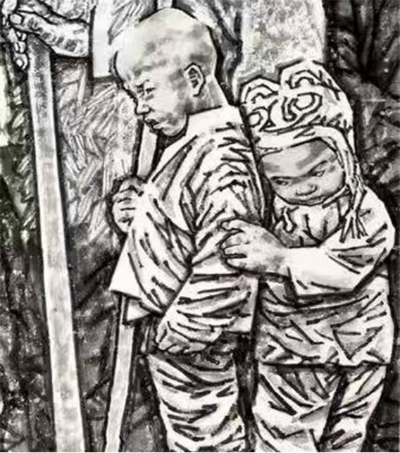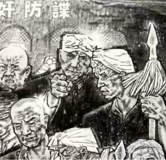 《锄汉奸》作品是在对历史承载集体记忆真实提炼的基础上,以戏剧性的画面予以构成,将隐喻、象征、联想等视觉符号相结合,把历史场景浓缩于这方宣纸之上。画面中央下端跪伏的三个汉奸形象,是移植的秦桧跪像符号的核心人物,成为了民族耻辱的当代投射。而上方环绕的八路军战士、陕北农民、知识分子、地方乡绅,这些妇孺老少则构成了一个象征性的“人民法庭”。陕北老汉怒目拄握的那把锄头,既是具象的农具,也是《锄汉奸》的民众之“锄”,更可谓是抽象的审判之锤,这种舞台化的艺术处理,超越了简单的历史再现。
