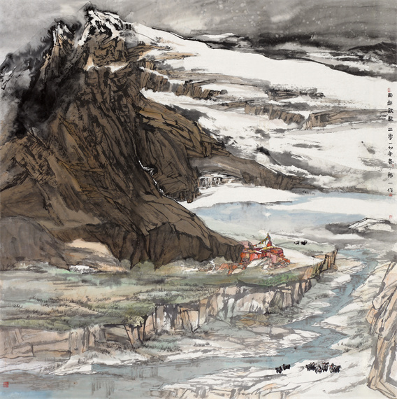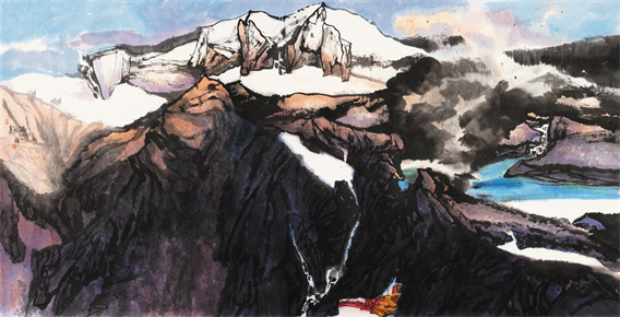 多年来,韩一的山水画创作始终没有离开雪域高原和壮丽山川,并将之称为“梦中的情山”。借景抒情是山水画的核心理念,山水画不仅是对自然万象的描绘,更是中国人观照世界、安顿心灵的视觉化表达,内蕴着中国人的哲学观、人生观。所以石涛说:“山川使予代山川而言也,山川脱胎于予也,予脱胎于山川也。”韩一对于高原山川的热爱既来自大自然的鬼斧神工带来的震撼,也来自她内心深处的壮阔情怀,以及对于中国山水文化渐次深入的认识。从少年时看到太行山时的震撼,到今天多次面对西藏高原和西北大川油然而生的亲切和熟悉,使她胸有丘壑。正因为胸有丘壑,韩一笔下的高原大川才有风雨晦明之形、纵横吞吐之势、阴阳浓淡之象,才会如此浑厚深远、气势撼人。为山川代言并与之“神遇而迹化”是石涛的追求,无疑也是韩一为之奋斗的理想。作为一位年轻的山水画家,韩一的未来可期。