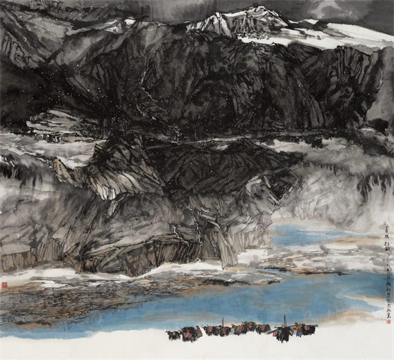 在当代山水画家群体中,女画家韩一是非常独特的一位。女性画家在中国美术史上并非罕有,但其画作绝大多数以婉约的闺阁体著称,比如元代的管道升,明代的马守真、文俶、薛素素,近现代也有何香凝、潘素、陆小曼等,她们多以文人画风格呈现女性特有的温婉和细腻,极少有以豪放派的风格名世的。当今女画家的创作较之以往要丰富许多,风格语言十分多元化,但在作品中也多体现女性的艺术特质,尤其注重个体经验和女性身份的表达。相形之下,韩一的绘画创作就显得十分特别,她既没有在画中表现温婉的女性生活,也没有陷入个体化的情感表达,而是将视角投注在似乎与女性毫不相干的巨川峻岭上。或许是偏爱大山大水的缘故,韩一的山水画多以雪域高原、西北大川为题材,笔墨豪放,构图开阔,景象雄浑,气势撼人。这种以顶天立地的图式和浑厚峭拔的气韵表现北方山水的崔嵬嵯峨的风格,可上溯至五代北宋,此时的山水画体现的是北方山水的雄强浑厚,与南宗山水形成鲜明反差。如果要从山水画发展的脉络上看,韩一的山水画无疑越过了元明清的清澹雅逸,直取五代北宋浑厚苍莽的特征,这可视作其风格的一个重要来源。除此之外,在高原边陲的写生和采风,也为其创作注入了雄强的魂魄。