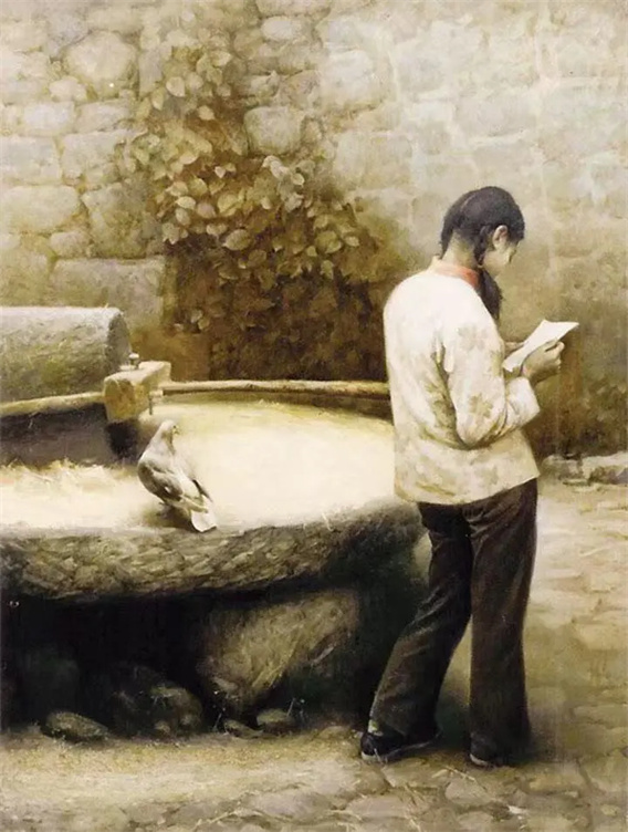画作核心的象征组合精妙而深刻。磨盘作为画面厚重的基石,是农业社会周而复始劳作的符号,承载着时间循环的沉重。而轻盈降临的鸽子,则如瞬间凝结的和平与希望,衔着来自远方的信息。石磨的凝重与鸽子的灵动构成强烈张力,无声揭示了个体灵魂在现实重压下对超越的深切渴望——少女手中展开的信纸,正是这沉重世界里一个珍贵的自由呼吸窗口。
