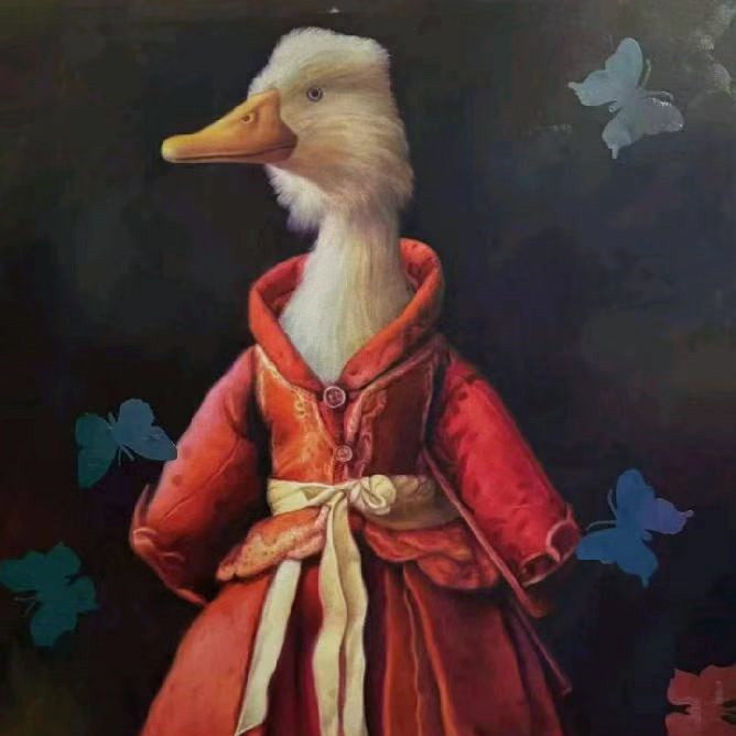 曾想过给它换个名字或“渡”或驻如同每个读者心目中哈姆雷特的不同。“渡”,是动态的生存智慧。红衣鸭或许正从“内卷”的河游向“躺平”的岸或现在此起彼伏的“躺不平”现状,亦从“蝴蝶标准”的绑架中突围。而若名《驻梦者》,则更强调静态的坚守——像Molly永远睁大的双眼,拒绝被梦境吞噬。这两种姿态,共同构成年轻世代的生命策略:一边适应规则,一边保留不合作的角落。程亚杰用油画的厚重质感赋予这场反抗以尊严:鸭子的红不是低廉的箔光,而是如故宫朱漆般沉郁;蝴蝶的翅膀也不单薄,它们带着巴洛克式的繁复,让这场对峙成为一场庄重的仪式。
