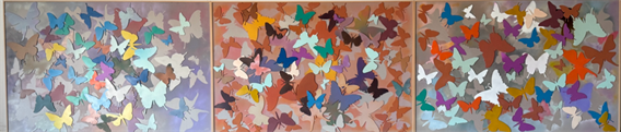 《暗香》的形式张力,首先源于程式美学的精准落地与程亚杰拉斯维加斯派风格的鲜明呈现。程亚杰拉斯维加斯派以数字扑克牌和蝴蝶字母等符号,大胆的色彩碰撞、强烈的视觉冲击为典型特征,《暗香》中三幅联画的色彩分区正是这一风格的具象化:左幅蓝紫基底上,粉蓝、鹅黄、浅灰的蝴蝶如幽谧夜空中的星群;中幅橙棕底色里,绯红、深褐、明黄的蝶影似烈焰中舞动的生命;右幅灰调背景聚合蓝、紫、橙、白诸色蝴蝶,形成视觉节奏的复调。这种色彩布局并非随意拼接,而是遵循程式美学中“秩序化”的视觉构建原则,通过明度、纯度对比与蝶影疏密排布,打造“冷—暖—中和”的视觉韵律,暗合“三部曲式”的音乐结构,让静态绘画拥有了时间性感知维度。