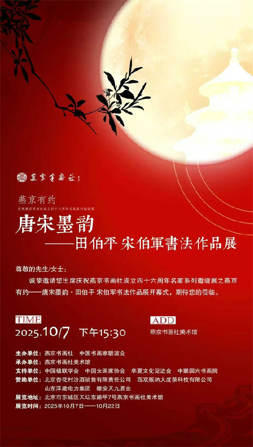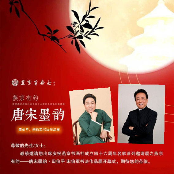 金秋送爽,丹桂飘香。值此中秋、国庆到来之际,燕京书画社隆重推出燕京有约“唐宋墨韵——田伯平、宋伯军书法展”,此次展览不仅是一场书法艺术的高端展示,还承载着喜迎佳节的美好祈愿,更是燕京书画社一年一度携手人品画品俱佳的艺术家,以人文视角打造中秋雅集品牌艺术活动的持续推进。