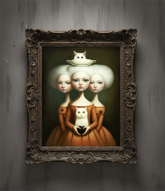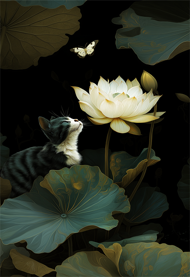 而《不眠的蝴蝶兰之梦》则在隐喻上更为柔和与诗意。作品捕捉了在一朵闪耀的兰花(蝴蝶兰)上,猫与蝴蝶在彼此的梦境中短暂重叠的瞬间。那短促而隐秘的相遇被解读为一则对动荡世界的“和谐”讯息。作品以视觉方式延长梦境中的一瞬,暗示即便在混乱之中亦存在微小和解与联结的可能。画中的猫与蝴蝶不仅仅是动物,更是通过梦与想象展示不同存在能够沟通的意象。