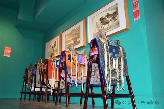 值得一提的是,展览中还特别呈现了中国工艺美术大师庞大伟的精制内蒙古马鞍。这些马鞍工艺绝伦、巧夺天工,融自然形韵与人文匠心于一体,成为承载着深厚文化的艺术珍品。展厅中,马鞍上纹饰的精密华彩与画中骏马的奔腾姿态彼此映照、相映成趣。