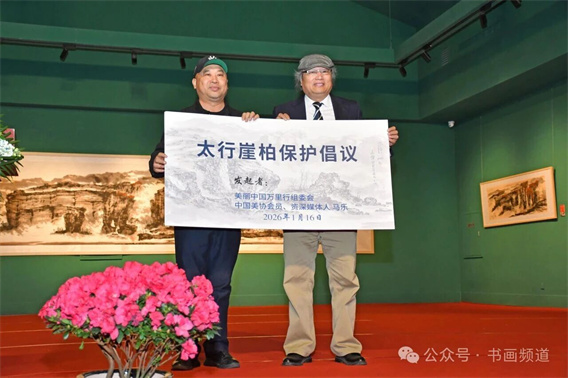 随后,马乐和美丽中国万里行组委会秘书长缪宏,共同宣布太行崖柏保护倡议。众多国内外艺术家发来贺信,中国外文局常务副局长郭晓勇专门创作诗歌为展览的成功举办表示祝贺。